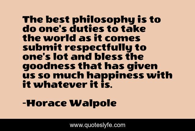 This page presents the quote "The best philosophy is to do one's duties to take the world as it comes submit respectfully to one's lot and bless the goodness that has given us so much happiness with it whatever it is.". Author of this quote is Horace Walpole. .