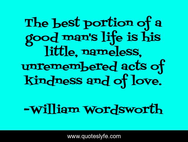 This page presents the quote "The best portion of a good man's life is his little, nameless, unremembered acts of kindness and of love.". Author of this quote is William Wordsworth. This quote is about life, kindness, good,.