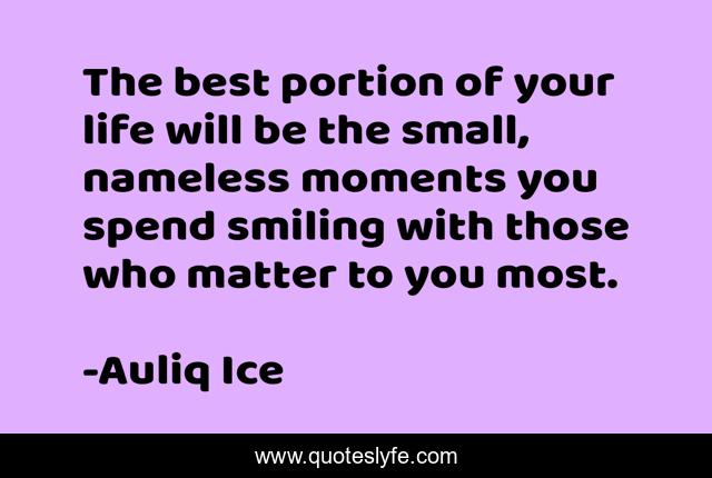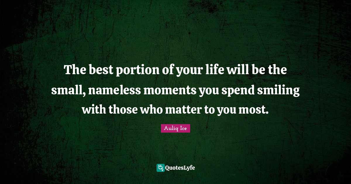 This page presents the quote "The best portion of your life will be the small, nameless moments you spend smiling with those who matter to you most.". Author of this quote is Auliq Ice. This quote is about caring, human-nature, love, humanity, affection,.