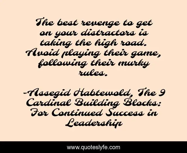 This page presents the quote "The best revenge to get on your distractors is taking the high road. Avoid playing their game, following their murky rules.". Author of this quote is Assegid Habtewold, The 9 Cardinal Building Blocks: For Continued Success in Leadership. This quote is about revenge, distractors,.