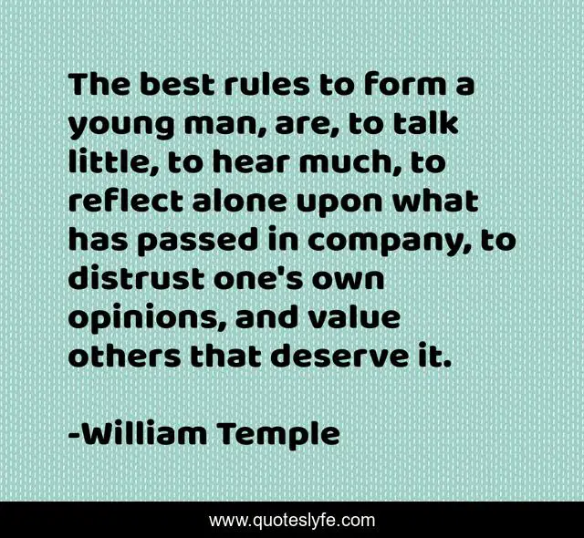This page presents the quote "The best rules to form a young man, are, to talk little, to hear much, to reflect alone upon what has passed in company, to distrust one's own opinions, and value others that deserve it.". Author of this quote is William Temple. This quote is about best, value, man,.