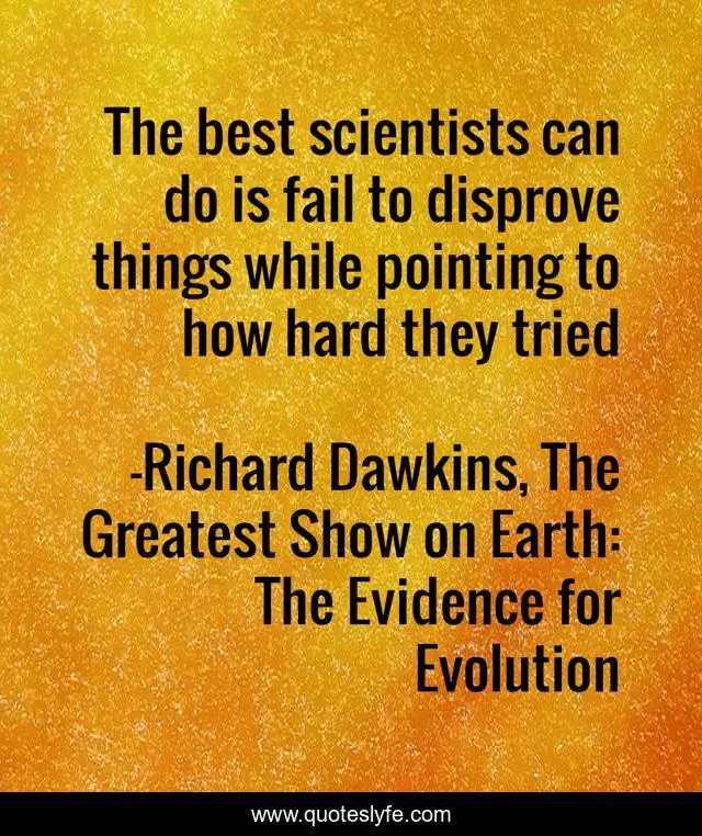 This page presents the quote "The best scientists can do is fail to disprove things while pointing to how hard they tried". Author of this quote is Richard Dawkins, The Greatest Show on Earth: The Evidence for Evolution. This quote is about evolution, science, try, scientists, trying, proof,.