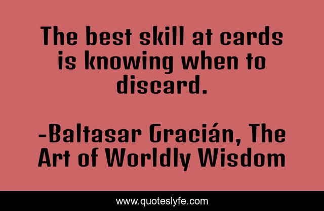 This page presents the quote "The best skill at cards is knowing when to discard.". Author of this quote is Baltasar Gracián, The Art of Worldly Wisdom. .