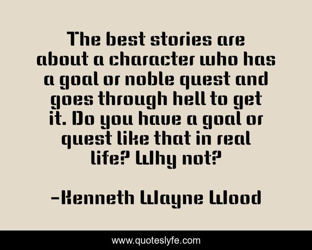 This page presents the quote "The best stories are about a character who has a goal or noble quest and goes through hell to get it. Do you have a goal or quest like that in real life? Why not?". Author of this quote is Kenneth Wayne Wood. This quote is about the-best-stories, goal-setting, quest, goals, goals-in-life,.