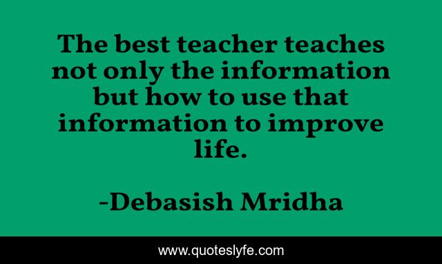 This page presents the quote "The best teacher teaches not only the information but how to use that information to improve life.". Author of this quote is Debasish Mridha. This quote is about how-to-use-information, philosophy, debasish-mridha, quotes, debasish-mridha-md, inspirational, enthusiasm, improve-life, best-teacher,.