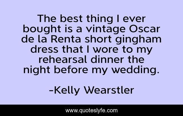 This page presents the quote "The best thing I ever bought is a vintage Oscar de la Renta short gingham dress that I wore to my rehearsal dinner the night before my wedding.". Author of this quote is Kelly Wearstler. This quote is about short, dress, best,.