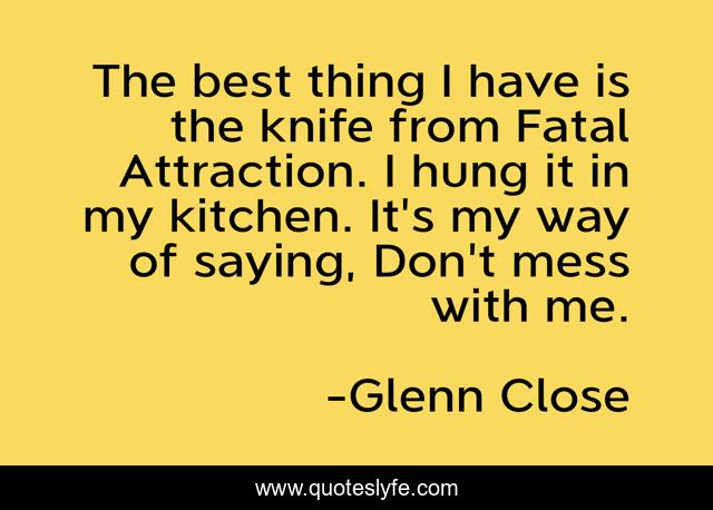 This page presents the quote "The best thing I have is the knife from Fatal Attraction. I hung it in my kitchen. It's my way of saying, Don't mess with me.". Author of this quote is Glenn Close. This quote is about me, saying, kitchen,.