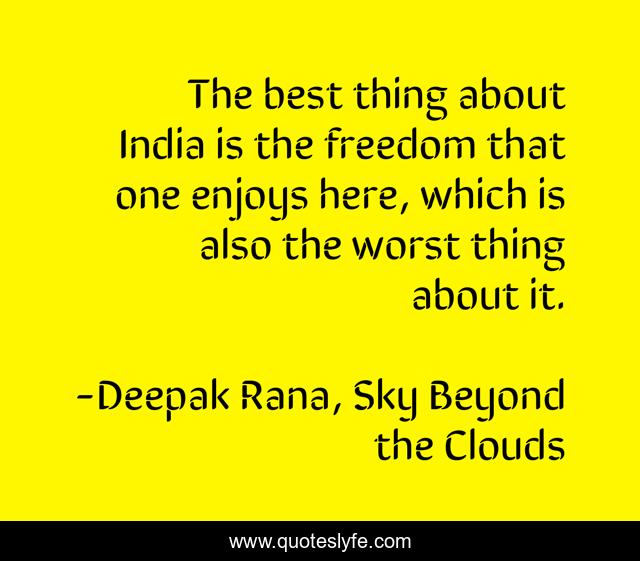 This page presents the quote "The best thing about India is the freedom that one enjoys here, which is also the worst thing about it.". Author of this quote is Deepak Rana, Sky Beyond the Clouds. This quote is about indian-politics, india, indian-society,.