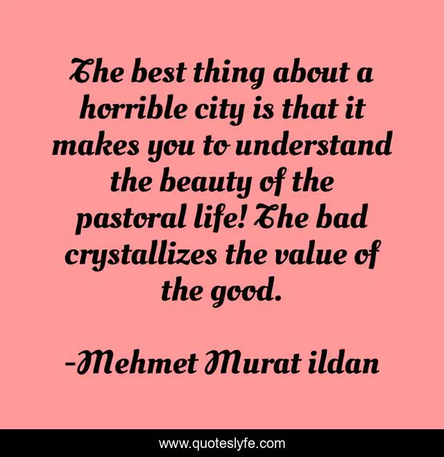 This page presents the quote "The best thing about a horrible city is that it makes you to understand the beauty of the pastoral life! The bad crystallizes the value of the good.". Author of this quote is Mehmet Murat ildan. .