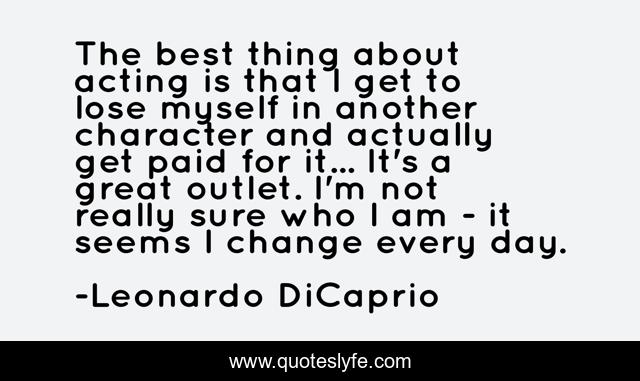 This page presents the quote "The best thing about acting is that I get to lose myself in another character and actually get paid for it... It's a great outlet. I'm not really sure who I am - it seems I change every day.". Author of this quote is Leonardo DiCaprio. This quote is about myself, great, best,.
