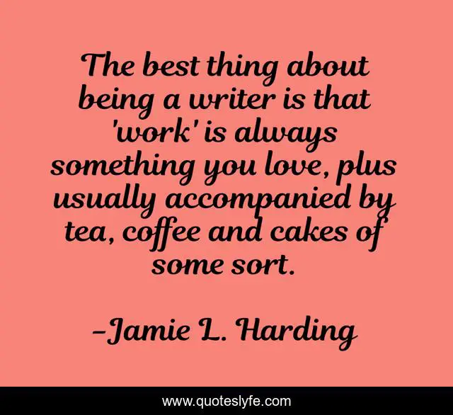 This page presents the quote "The best thing about being a writer is that 'work' is always something you love, plus usually accompanied by tea, coffee and cakes of some sort.". Author of this quote is Jamie L. Harding. This quote is about cakes, literature, love, author, tea, work, coffee, writing, writer,.
