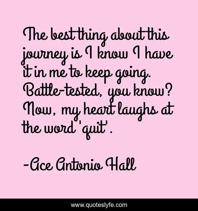 This page presents the quote "The best thing about this journey is I know I have it in me to keep going. Battle-tested, you know? Now, my heart laughs at the word 'quit'.". Author of this quote is Ace Antonio Hall. This quote is about quote, quotes-of-life,.