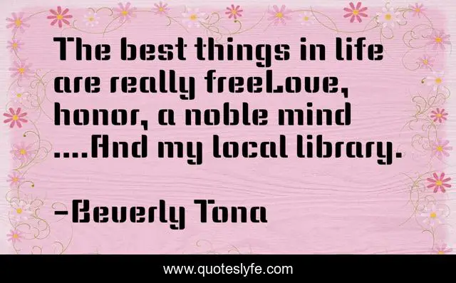 This page presents the quote "The best things in life are really freeLove, honor, a noble mind ....And my local library.". Author of this quote is Beverly Tona. This quote is about free, love, library, affection, honor,.