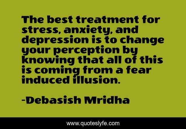 This page presents the quote "The best treatment for stress, anxiety, and depression is to change your perception by knowing that all of this is coming from a fear induced illusion.". Author of this quote is Debasish Mridha. This quote is about anxiety, how-to-deal-with-stress, philosophy, debasish-mridha, depression, quotes, debasish-mridha-md, inspirational, enthusiasm,.