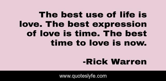 This page presents the quote "The best use of life is love. The best expression of love is time. The best time to love is now.". Author of this quote is Rick Warren. This quote is about life, love, the-purpose-driven-life, sacrifice, time, affection,.