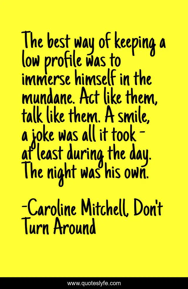 This page presents the quote "The best way of keeping a low profile was to immerse himself in the mundane. Act like them, talk like them. A smile, a joke was all it took - at least during the day. The night was his own.". Author of this quote is Caroline Mitchell, Don't Turn Around. This quote is about fiction-novel, serial-killer, thriller,.