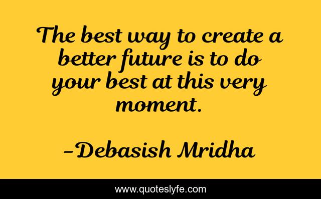 This page presents the quote "The best way to create a better future is to do your best at this very moment.". Author of this quote is Debasish Mridha. This quote is about create-a-better-future, do-your-best, philosophy, debasish-mridha, quotes, debasish-mridha-md, inspirational, enthusiasm, live-in-the-moment,.