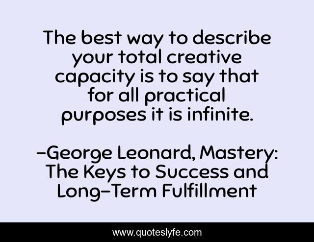 This page presents the quote "The best way to describe your total creative capacity is to say that for all practical purposes it is infinite.". Author of this quote is George Leonard, Mastery: The Keys to Success and Long-Term Fulfillment. This quote is about potential, creativity, potential-for-greatness,.