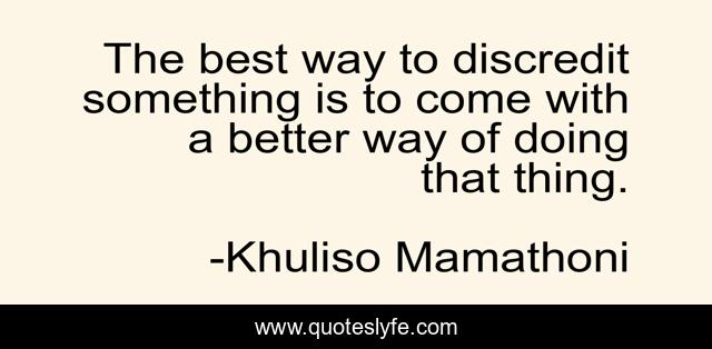 This page presents the quote "The best way to discredit something is to come with a better way of doing that thing.". Author of this quote is Khuliso Mamathoni. This quote is about confidence, positive, motivational, wisdom, optimistic, inspirational, enthusiasm,.