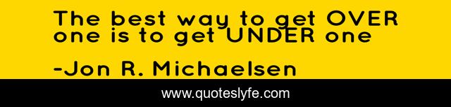 This page presents the quote "The best way to get OVER one is to get UNDER one". Author of this quote is Jon R. Michaelsen. This quote is about relationships, lovers, love, divorce, relationship-advice, girlfriends, breaking-up, heartbreak, many-fish-in-the-sea,.