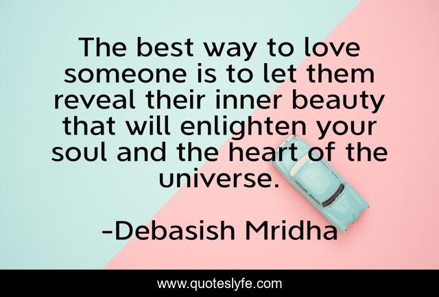 This page presents the quote "The best way to love someone is to let them reveal their inner beauty that will enlighten your soul and the heart of the universe.". Author of this quote is Debasish Mridha. This quote is about inner-beauty, debasish, heart-of-the-universe, enlighten-your-soul, mridha, philosophy, debasish-mridha, love-someone, heart,.