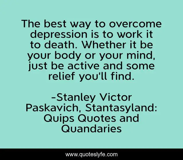 This page presents the quote "The best way to overcome depression is to work it to death. Whether it be your body or your mind, just be active and some relief you’ll find.". Author of this quote is Stanley Victor Paskavich, Stantasyland: Quips Quotes and Quandaries. This quote is about therapy, psychology, depression, relief,.