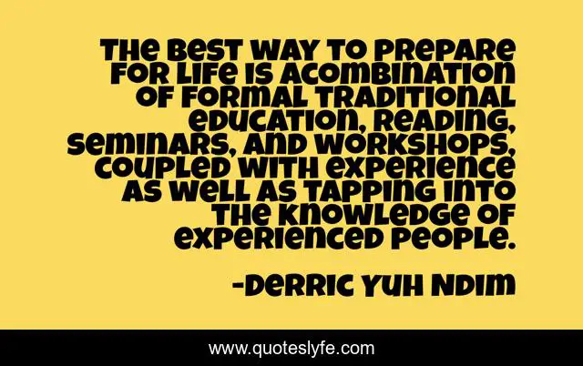 This page presents the quote "The best way to prepare for life is acombination of formal traditional education, reading, seminars, and workshops, coupled with experience as well as tapping into the knowledge of experienced people.". Author of this quote is Derric Yuh Ndim. This quote is about entrepreneurship-training, inspiration, thinking, actions, entrepreneurship, unlocking-your-true-potential, values, inspirational-for-writers, personal-development,.
