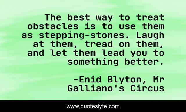 This page presents the quote "The best way to treat obstacles is to use them as stepping-stones. Laugh at them, tread on them, and let them lead you to something better.". Author of this quote is Enid Blyton, Mr Galliano's Circus. This quote is about stepping-stone, obstacles, tread, laugh,.