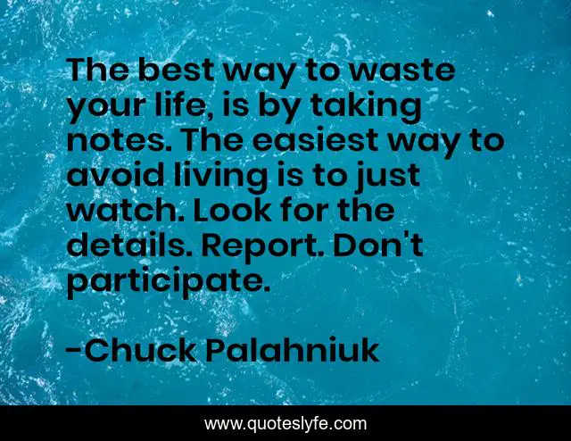 This page presents the quote "The best way to waste your life, is by taking notes. The easiest way to avoid living is to just watch. Look for the details. Report. Don't participate.". Author of this quote is Chuck Palahniuk. This quote is about lessons, life,.