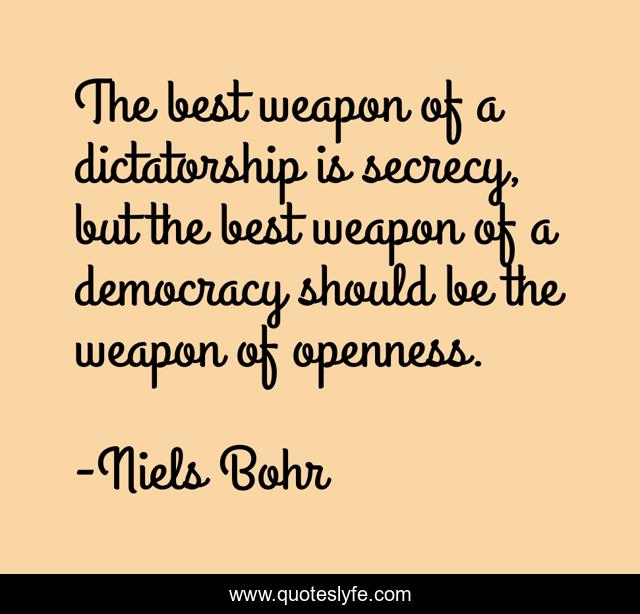 This page presents the quote "The best weapon of a dictatorship is secrecy, but the best weapon of a democracy should be the weapon of openness.". Author of this quote is Niels Bohr. This quote is about democracy, dictatorship,.