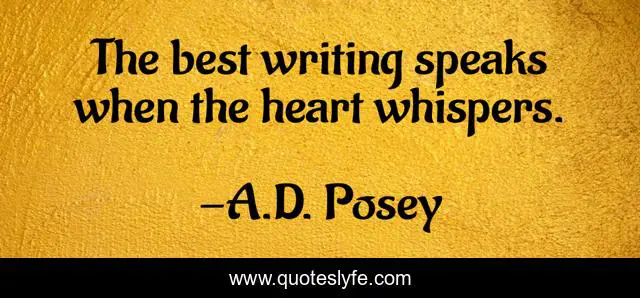 This page presents the quote "The best writing speaks when the heart whispers.". Author of this quote is A.D. Posey. This quote is about heart, women-wisdom, love, inspirational, energy, authors, writers, quotes, ad-posey,.