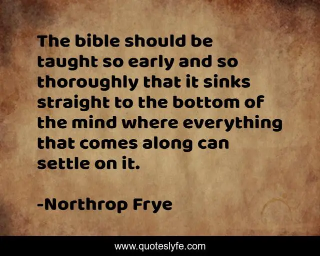 This page presents the quote "The bible should be taught so early and so thoroughly that it sinks straight to the bottom of the mind where everything that comes along can settle on it.". Author of this quote is Northrop Frye. .