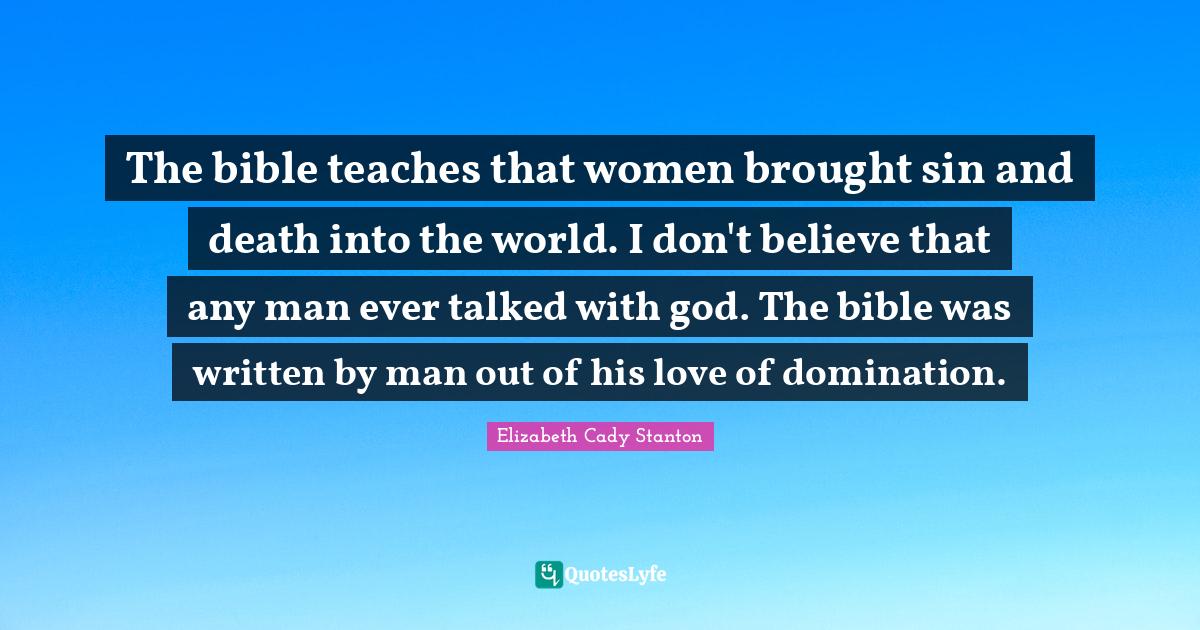 This page presents the quote "The bible teaches that women brought sin and death into the world. I don't believe that any man ever talked with god. The bible was written by man out of his love of domination.". Author of this quote is Elizabeth Cady Stanton. This quote is about death, men, domination, bible, sin, women, god, his love, believe,.