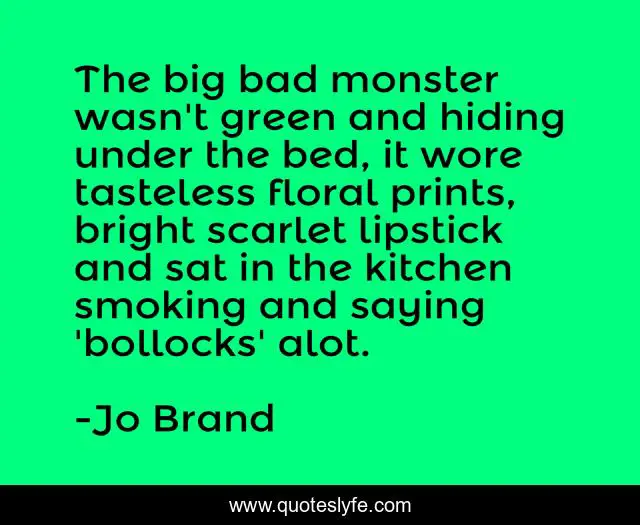 This page presents the quote "The big bad monster wasn't green and hiding under the bed, it wore tasteless floral prints, bright scarlet lipstick and sat in the kitchen smoking and saying 'bollocks' alot.". Author of this quote is Jo Brand. .