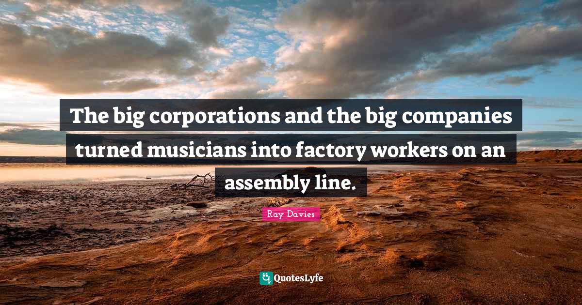 This page presents the quote "The big corporations and the big companies turned musicians into factory workers on an assembly line.". Author of this quote is Ray Davies. This quote is about factory workers, corporations, assembly line, rock and roll, lines,.