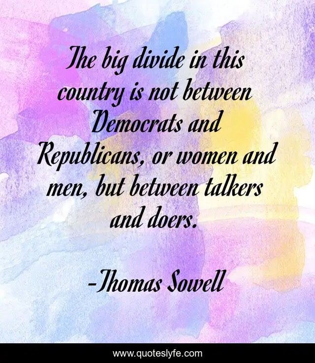 This page presents the quote "The big divide in this country is not between Democrats and Republicans, or women and men, but between talkers and doers.". Author of this quote is Thomas Sowell. This quote is about country, men, between,.