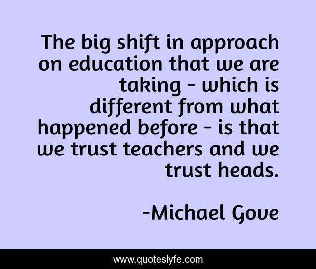 This page presents the quote "The big shift in approach on education that we are taking - which is different from what happened before - is that we trust teachers and we trust heads.". Author of this quote is Michael Gove. This quote is about education, teachers,.