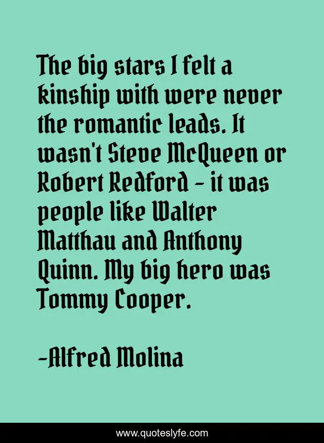 This page presents the quote "The big stars I felt a kinship with were never the romantic leads. It wasn't Steve McQueen or Robert Redford - it was people like Walter Matthau and Anthony Quinn. My big hero was Tommy Cooper.". Author of this quote is Alfred Molina. This quote is about hero, stars, people,.