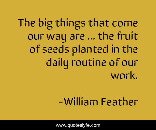 This page presents the quote "The big things that come our way are ... the fruit of seeds planted in the daily routine of our work.". Author of this quote is William Feather. .