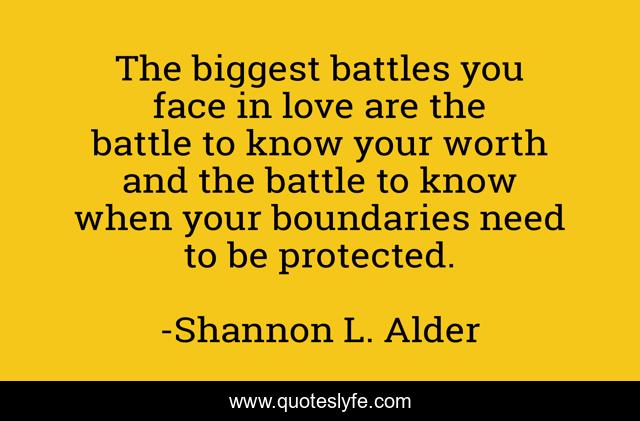 This page presents the quote "The biggest battles you face in love are the battle to know your worth and the battle to know when your boundaries need to be protected.". Author of this quote is Shannon L. Alder. This quote is about boundaries, worth, battles,.