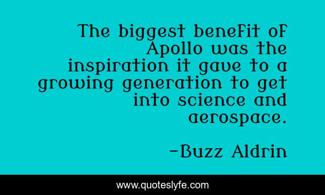 This page presents the quote "The biggest benefit of Apollo was the inspiration it gave to a growing generation to get into science and aerospace.". Author of this quote is Buzz Aldrin. This quote is about generation, inspiration,.