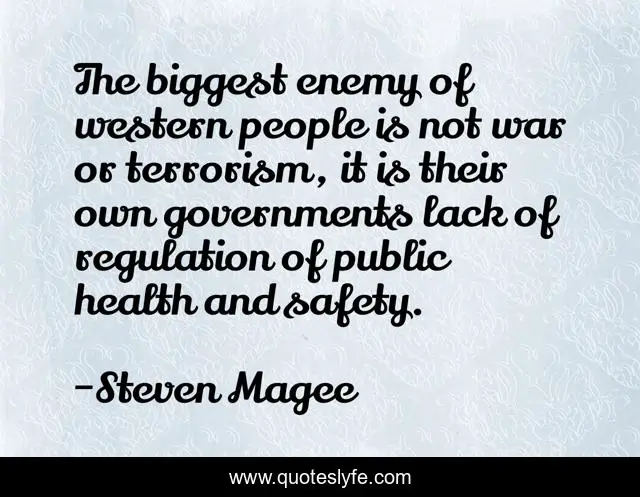 This page presents the quote "The biggest enemy of western people is not war or terrorism, it is their own governments lack of regulation of public health and safety.". Author of this quote is Steven Magee. This quote is about enemy, own, government, federal, west, lack, people, public, biggest,.