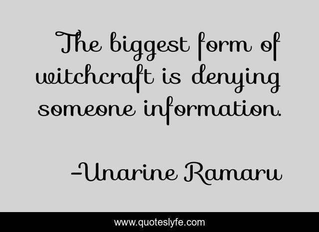This page presents the quote "The biggest form of witchcraft is denying someone information.". Author of this quote is Unarine Ramaru. This quote is about information, sharing, education, humanity, society,.