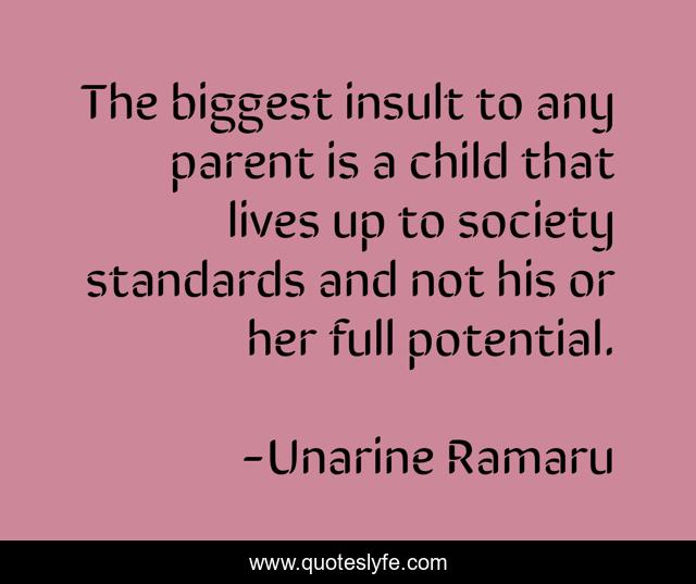 This page presents the quote "The biggest insult to any parent is a child that lives up to society standards and not his or her full potential.". Author of this quote is Unarine Ramaru. This quote is about full-potential, insult, society, parents, standards, children,.