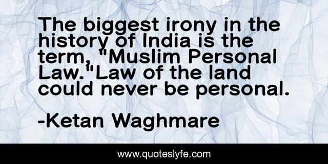 This page presents the quote "The biggest irony in the history of India is the term, "Muslim Personal Law."Law of the land could never be personal.". Author of this quote is Ketan Waghmare. This quote is about entitlement, joke, irony, india, intellectual, hyporcrisy,.