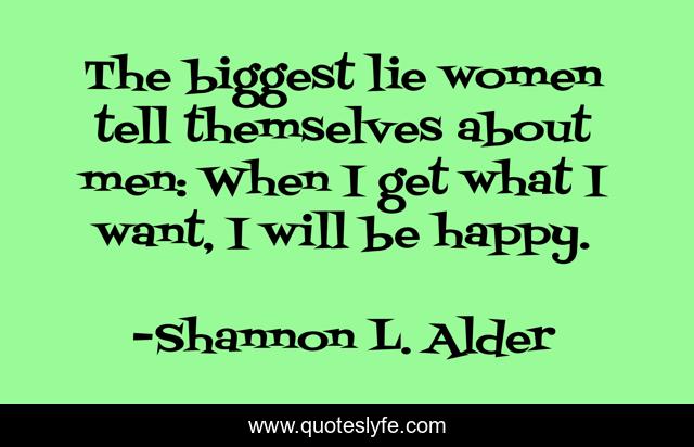 This page presents the quote "The biggest lie women tell themselves about men: When I get what I want, I will be happy.". Author of this quote is Shannon L. Alder. This quote is about relationships, dating, personal-achievements, personal-growth, delusional-love, competition, life-missions, enjoy-the-ride, lies,.
