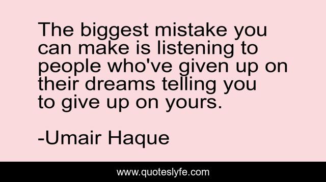 This page presents the quote "The biggest mistake you can make is listening to people who've given up on their dreams telling you to give up on yours.". Author of this quote is Umair Haque. This quote is about giving-up, mistakes, dreams, inspirational, enthusiasm,.