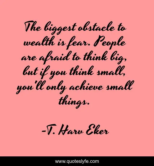 This page presents the quote "The biggest obstacle to wealth is fear. People are afraid to think big, but if you think small, you'll only achieve small things.". Author of this quote is T. Harv Eker. This quote is about small things, small, wealth,.