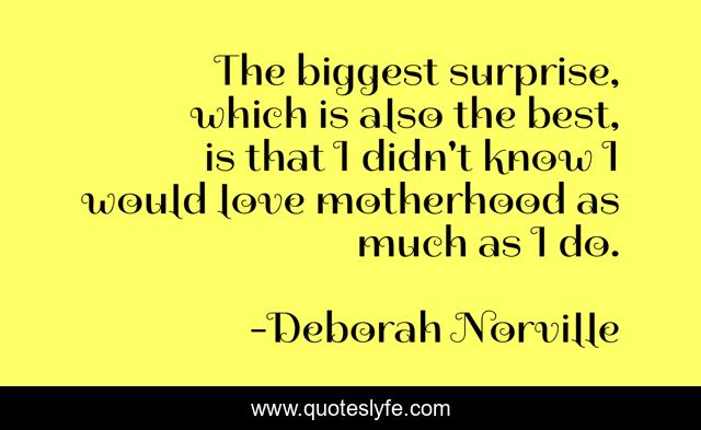 This page presents the quote "The biggest surprise, which is also the best, is that I didn't know I would love motherhood as much as I do.". Author of this quote is Deborah Norville. This quote is about motherhood, best, mom,.