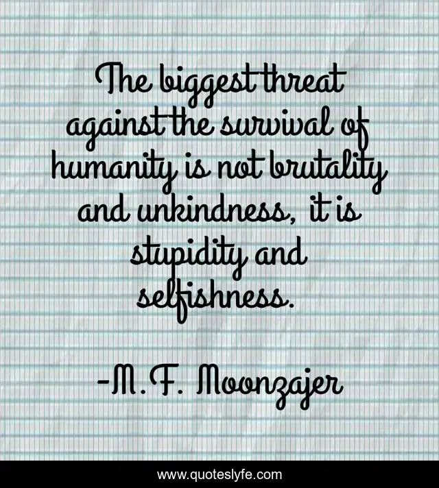 This page presents the quote "The biggest threat against the survival of humanity is not brutality and unkindness, it is stupidity and selfishness.". Author of this quote is M.F. Moonzajer. This quote is about selfishnesh, brutality, survival, unkindness, stupidity, threat, humanity,.